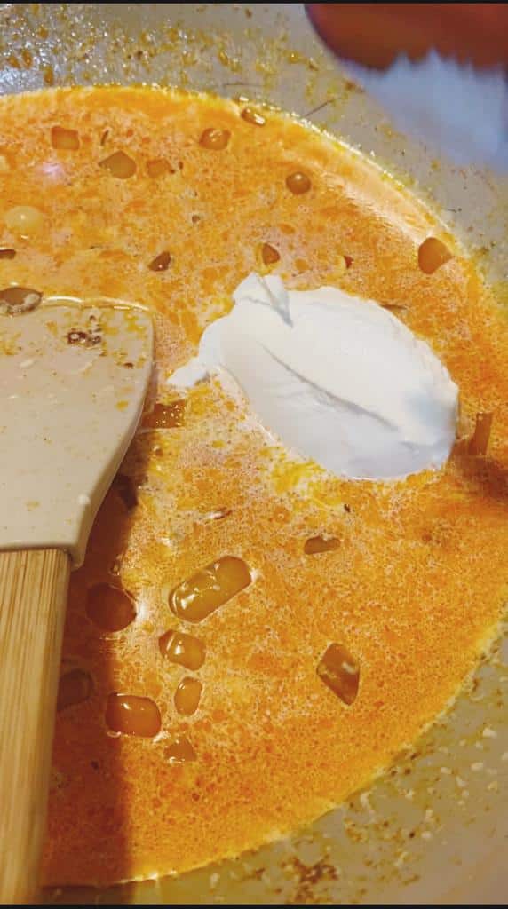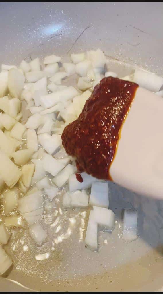 In the same pan, cook the chopped onions for 5–6 minutes until soft and golden. Add the gochujang paste and stir for extra depth and mild heat.