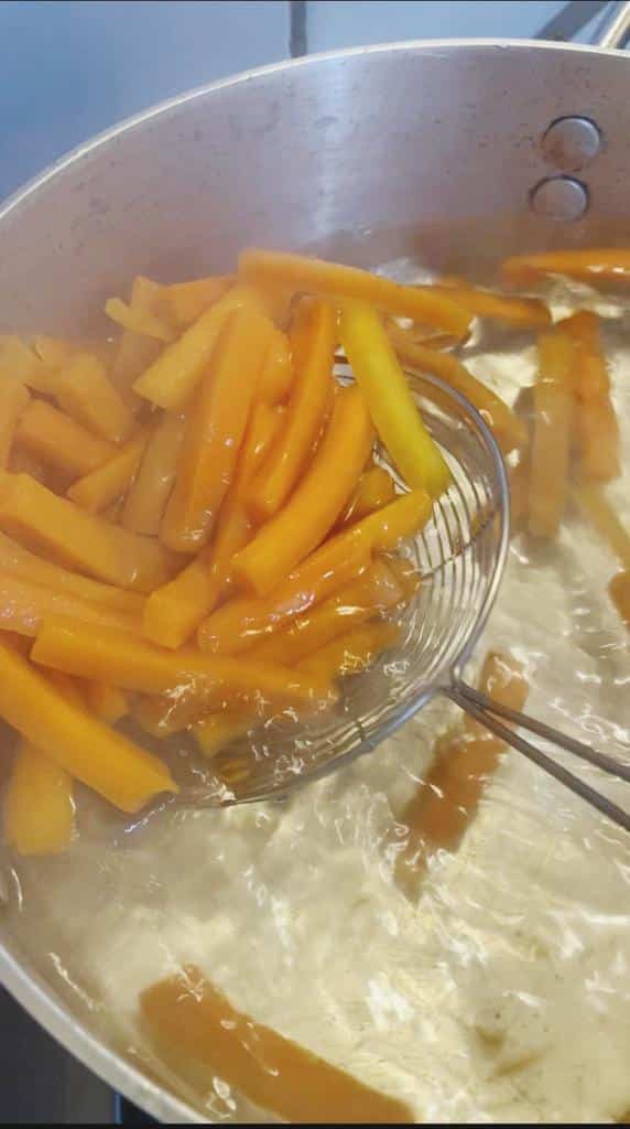 In a separate pot, boil the julienned carrots with a pinch of salt for 5 to 7 minutes until just tender. Drain, let cool, and set aside. The natural sweetness of the carrots adds a perfect contrast to the rich, creamy sauce later on.