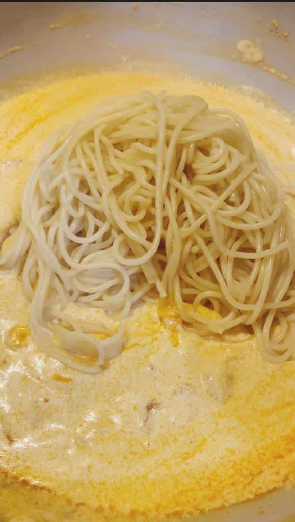 Add the cooked spaghetti into the sauce and toss until every strand is coated in the creamy, cheesy goodness.
