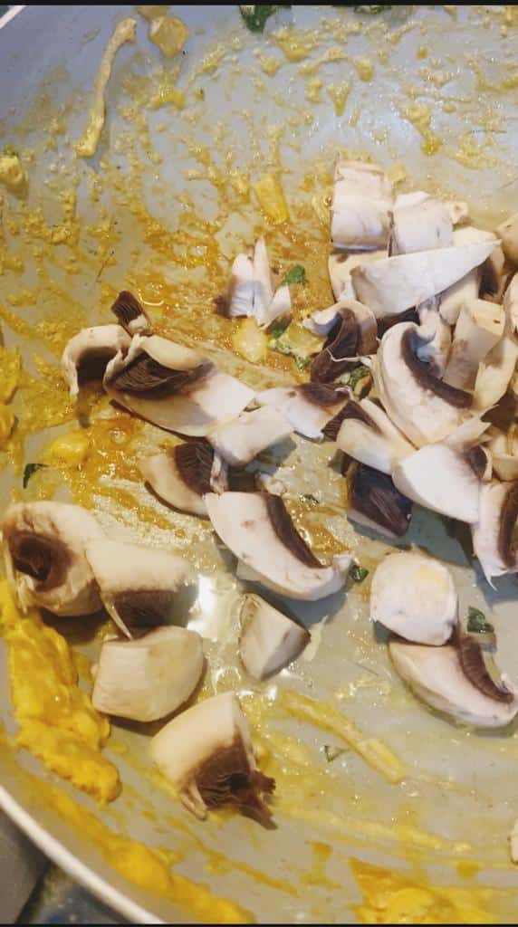 In a separate pan, cook mushrooms in leftover chicken oil until golden. This adds richness and earthy flavor to the final dish.