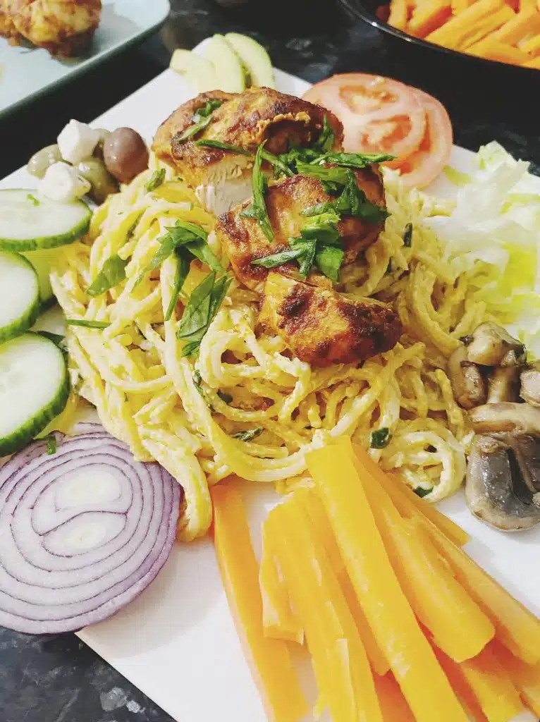 Place a generous portion of creamy spaghetti into a bowl or plate. Top with sliced baked chicken and your choice of fresh vegetables—avocados, cucumbers, red onions, tomatoes, spinach, olives, and sweet carrots.